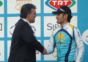 Казахстанский гонщик Асан Базаев из велокоманды Астанастал первым в итоговой классификации по очкам на многодневной гонкепервой категории «Президентский Тур Турции». На последнем седьмом этапеБазаев финишировал 3-м вслед за Максом Ричезе и Андре Шульцом. Базаевснял зеленую майку с плеч итальянца Маттео Приамо – победителя 2-хэтапов на Туре Турции. Асан Базаев (27 лет, уроженец Астаны)финишировал на прошедшей неделе 5 раз в первой десятке. Он получилцветы из рук Президента Турции Абдуллы Гюля. Следующей гонкой для АсанаБазаева станет «Четыре дня Дункерка» с 6 по 11 мая.