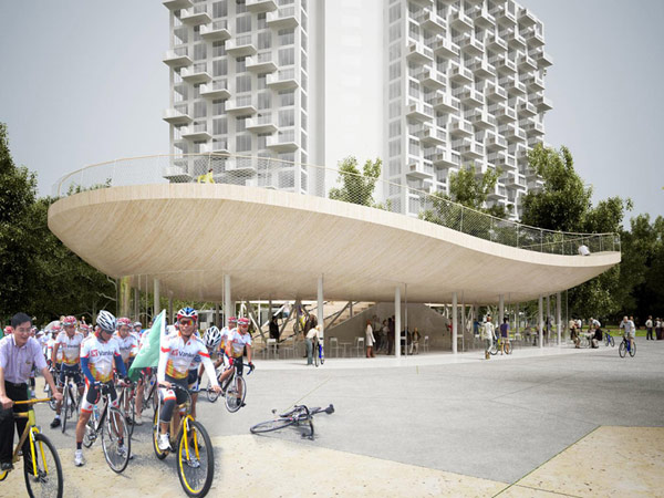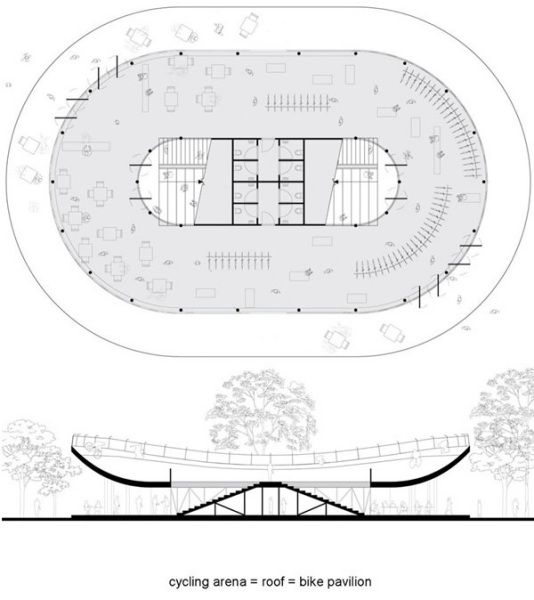 Второй уровень служит небольшой велосипедной ареной, овальная платформа которой выступает и в качестве навеса, дающего отдыхающим тень – одно из основных условий комфорта в условиях местного климата.