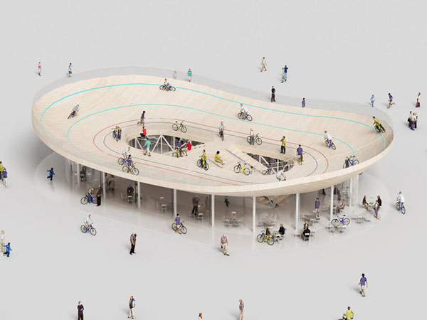 На второй уровень, где все желающие могут прогуливаться и кататься на велосипедах, ведет лестница, под которой компактно поместились уборные. Велодром с внешней и внутренней сторон оборудован прозрачными ограждениями из сетки и металла, что обеспечивает безопасность велосипедистов при сохранении внешней легкости и прозрачности структуры.