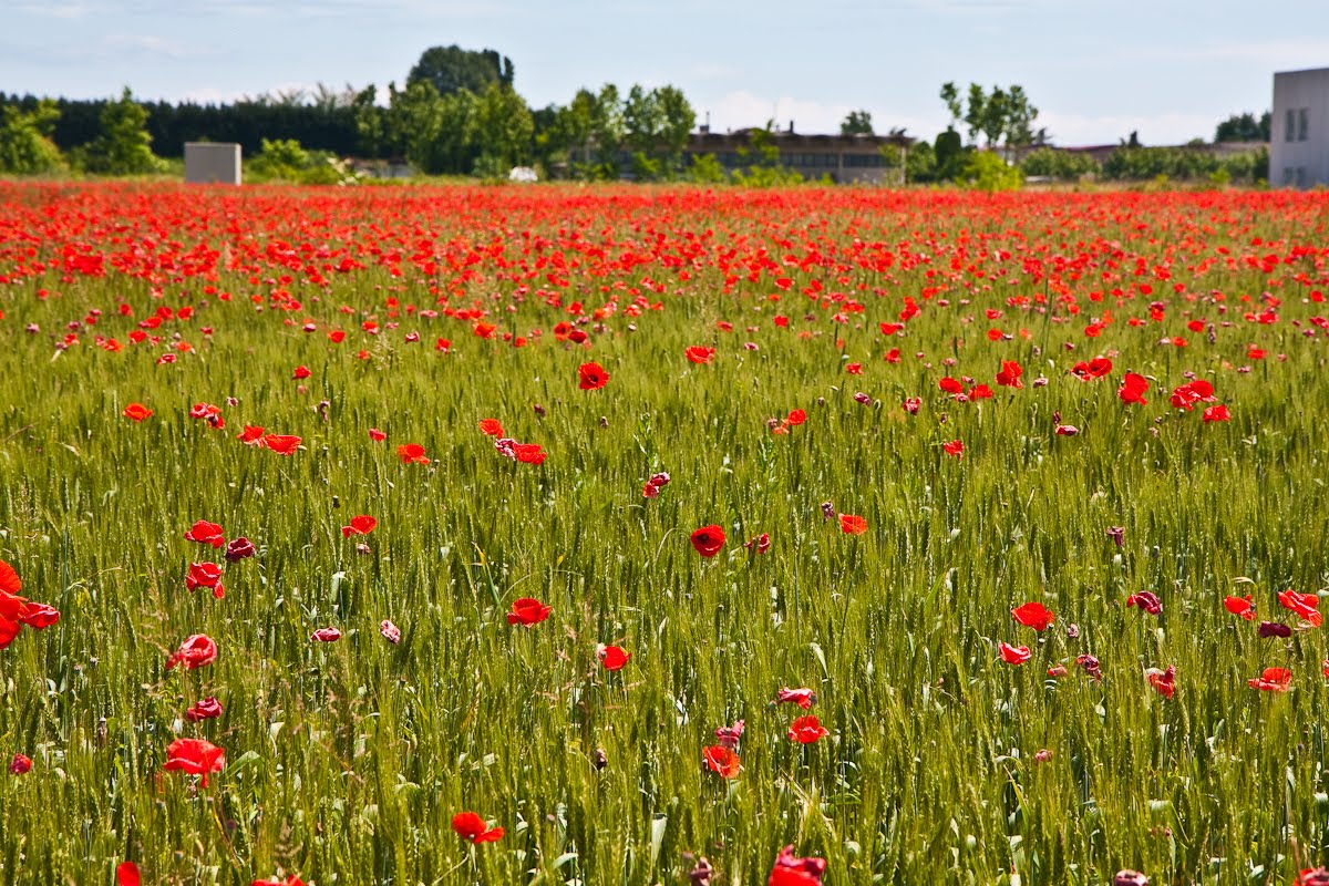 Следующий пункт - Кастелфранко Венето, точнее судя по карте, деревенька до него. Выставляю название деревеньки - навигатор оптимистично обещает вагон времени с маленькой тележкой, а подо мной не педали, а современный двигатель внутреннего сгорания, пусть даже и с одним цилиндриком. По дороге belpaese тщательно разворачивает полотнище с изображением запоздалой весны. Я все время отвлекаюсь на огромные цветущие маковые поля и в какой-то момент разбазариваю тележку времени на съемку, а затем и еще одну на легкий перекус.