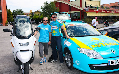 Скутер - не самый удобный транспорт для пожирания сотен километров, но план был попробовать угнаться за командой в течении всего 14-го этапа, и стояние в пробках в план не входило, а двухколесный транспорт - лучшее лекарство от пробок. По дороге два раза предательски проскальзывал приводной ремень, я мысленно приготовился к худшему, и сбавил скорость. Больше капризничать С1 не захотел, но в итоге в Ферраре я оказался поздновато и команду удалось разыскать к моменту, когда большинство гонщиков уже уехали к старту. Зато застал Шефа, Юрия Кулишкина и Сергея Лаврененко и успел поздороваться. Пожелать хорошим людям здоровья - уже неплохое начало!