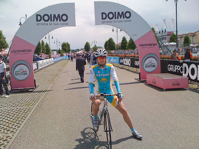 Начало этапа и велогонщиков ему удалось найти не сразу и я с удовольствием поработал навигатором, отслеживая его продвижение к Фиденце. Оказалось он хорошо знает Валентина и Романа, так что вот - все трое в кадре снимка с телефонной камеры. Вот вам портрет настоящего Астанафана! Одеться так, не зная что встретишься со своей любимой командой (или быть готовым всегда? =) и при этом выглядеть больше велогонщиком, чем велогонщики - только знаток разглядит, что болельщика отличает только то, что он сидит на алюминиевой Скоттине, а не на карбоновом S-Works.