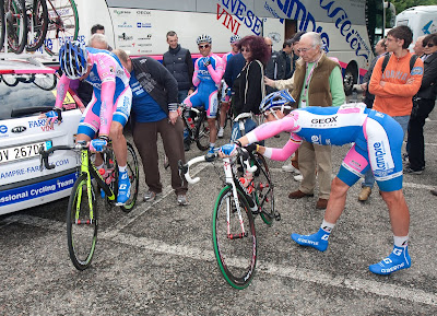Еду на перекресток улиц 23 марта и Юлия Цезаря (куда от него деться?). И странное ощущение, часть пути мой автомобиль и все остальные обгоняют гонщики, лавируя между машинами как самые обычные городские велосипедисты. Только номера и выдают, что этот не косит под Тиралонго, а им и является. По пути хватаю в баре бутерброд и обедаю в Новаре. А вот уже и пелотон.