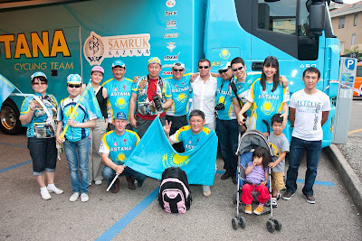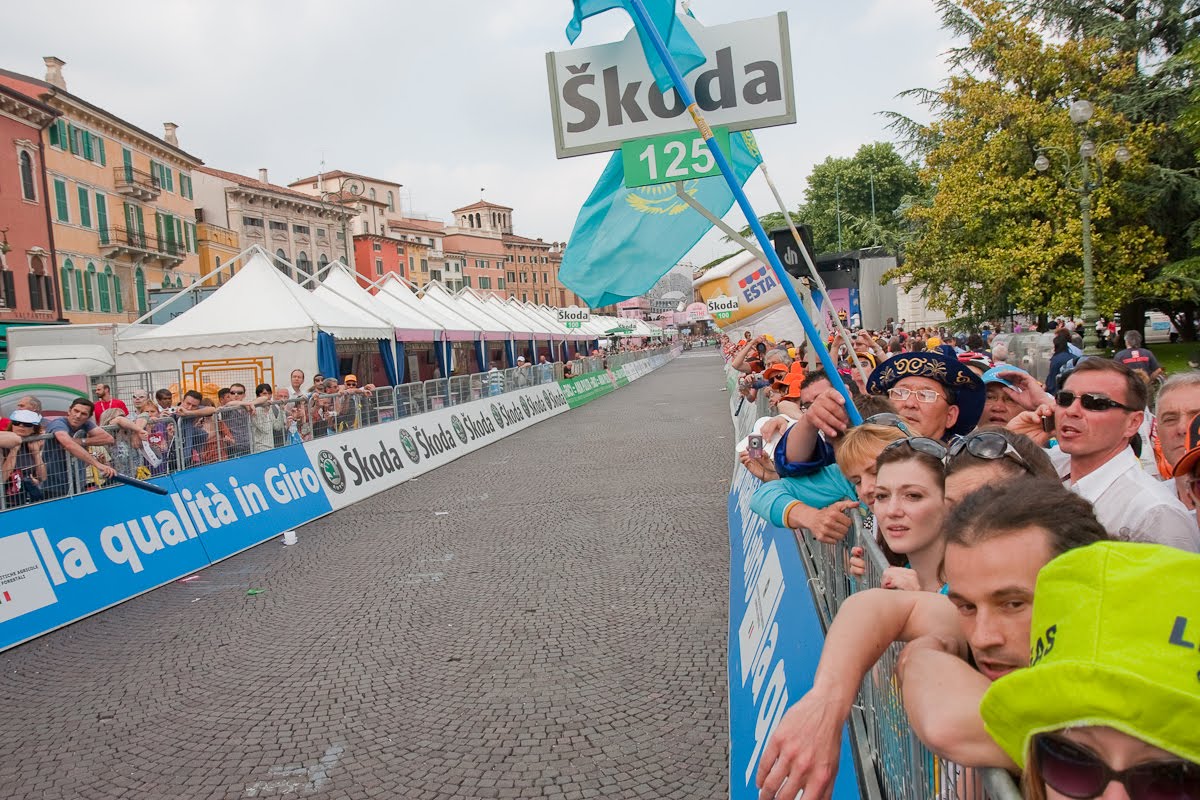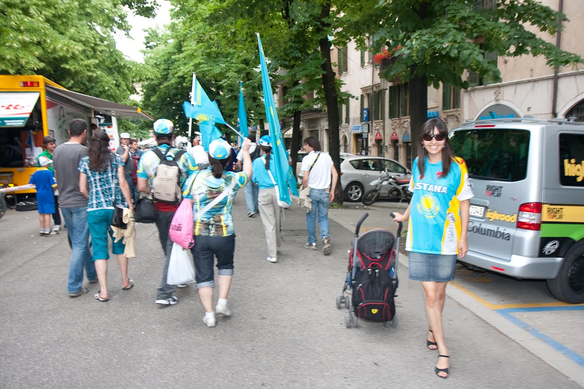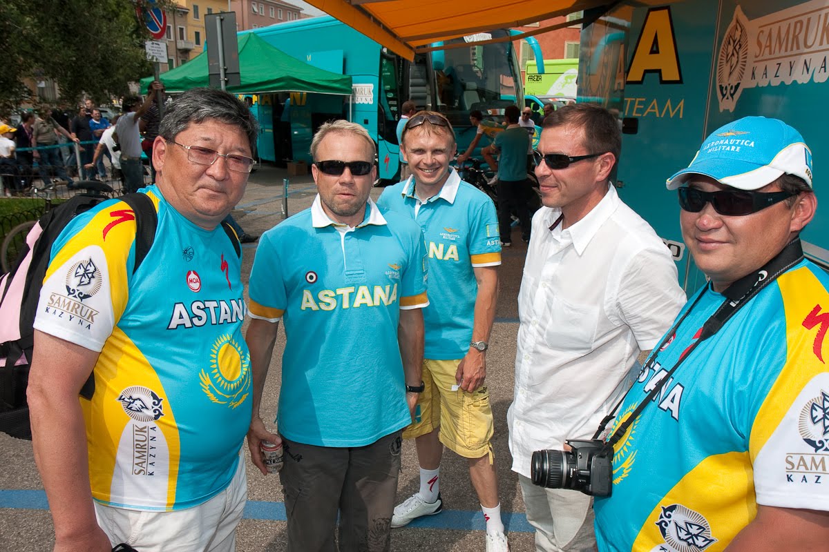 Мы не питали особых надежд на эмоциональный просмотр заключительной разделки. Вспоминались запруженные Елисейские Поля в день финала Тура (там самая полезная вещь для велофана - стремянка) и поэтому уверен был: комфортно поболеть не удастся. Но велосипедный бог - существо загадочное и сегодня он решил нам подарить VIP пакет. Подъезжая к Вероне по А4 увидели, что болельщикам Джиро рекомендуется выход Verona Sud. Решили попробовать и с удивлением увидели пустые дороги. Все ближе и ближе Corso Cavour, но нет ни машин, ни кордонов, сплошной зеленый свет. И мы доезжаем на машине прямо к автобусу Астаны, причем в 200 метрах от автобуса стоит, дожидается свободное место! А дальше нас ждет главное - у автобуса разбил лагерь клуб Vino 4ever!! От автобуса уезжает на старт Андрей Гривко, у автобуса разминается Хуфре.